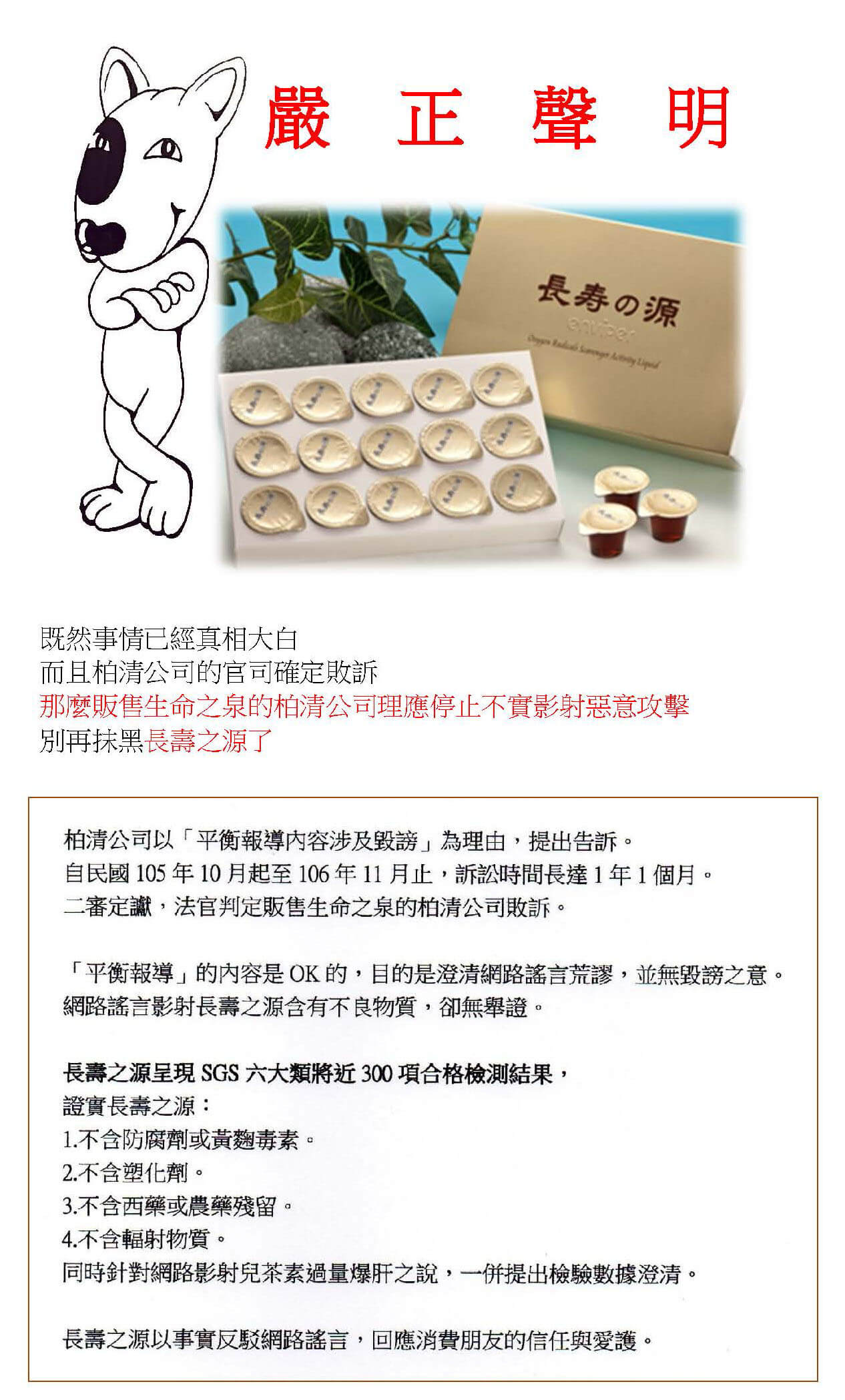 公司自創立以來,所有同仁皆以一貫嚴謹態度進行研發、生產,公司所銷售之每項商品,除經公司內部嚴格篩選把關外,並經由專業檢驗機構SGS檢驗通過合格,生產製程通過HACCP、HALAL、ISO22000認證程序,並設立符合GMP規範之標準廠房及衛生級的製造設備生產合格商品,並獲得消費者與業者一致之推崇及肯定。惟頃近有不肖業者,為牟取不法商業利益,故意在網路上散布不實謠言,惡意攻擊、汙衊、詆毀本公司,誤導借錢者,本公司近期並已正式委託律師提告,由檢調介入偵辦調查,以正視聽,請散布謠言者勿再以身試法,否則依據一罪一罰原則,違法者除將面臨長期牢獄之災,本公司也絕不再通融寬待,切勿自毀前程。