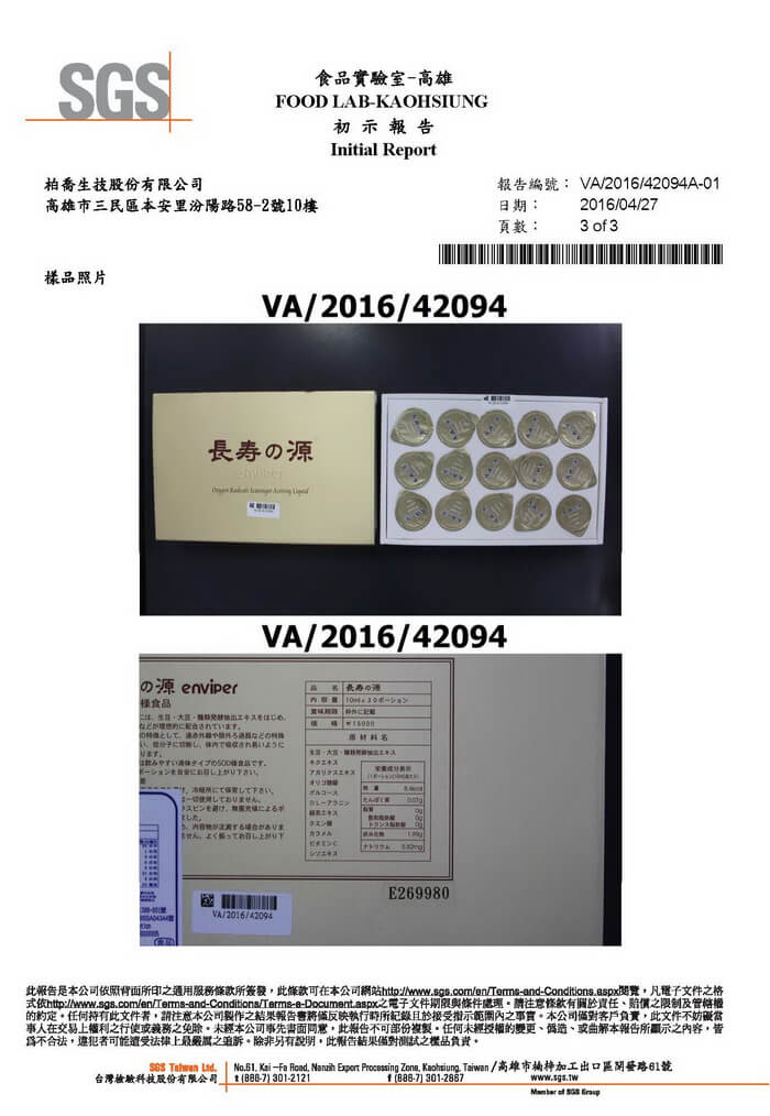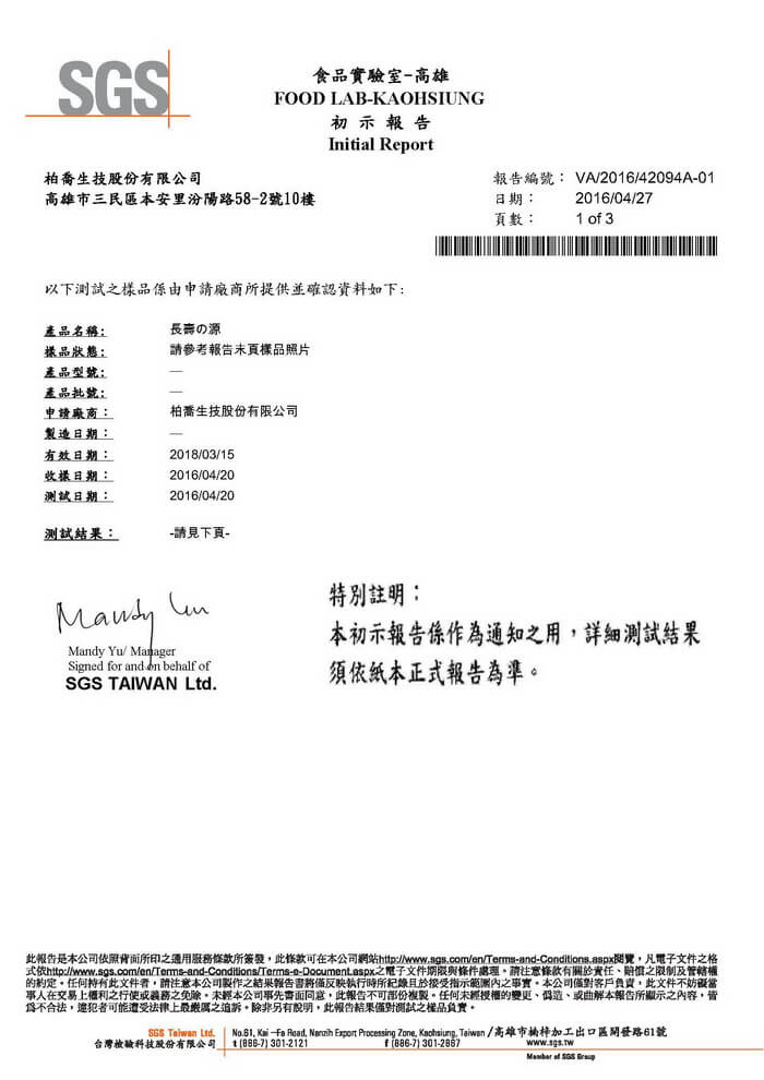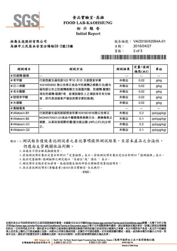 長壽の源-防腐劑,黃趜毒素檢測產品檢驗報告